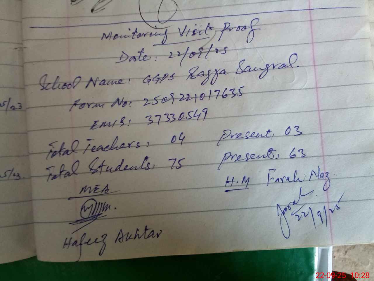 | Monitoring Date: 22-09-2025 | Start Time: 22-09-2025 10:05 AM | End Time: 22-09-2025 10:33 AM | Name of MEA: Sy**** Ha**** Ak**** | |