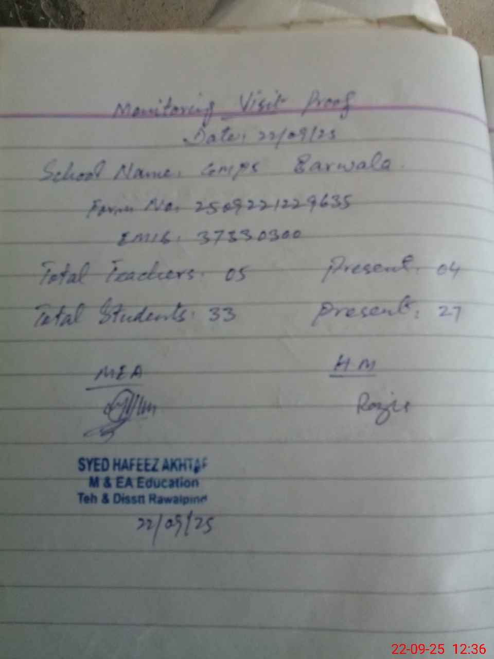 | Attendance Register | Head Teacher | MEA with School | Visit Proof |