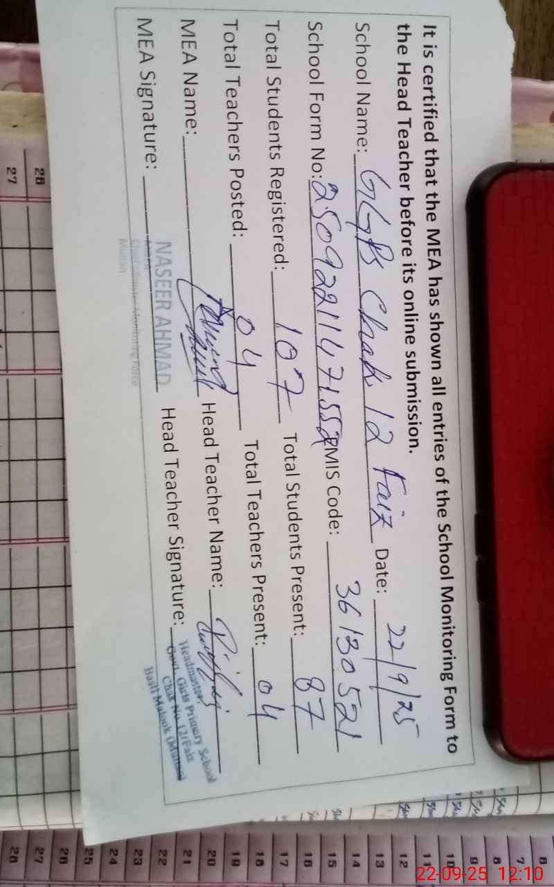 | Attendance Register | Head Teacher | MEA with School | Visit Proof |