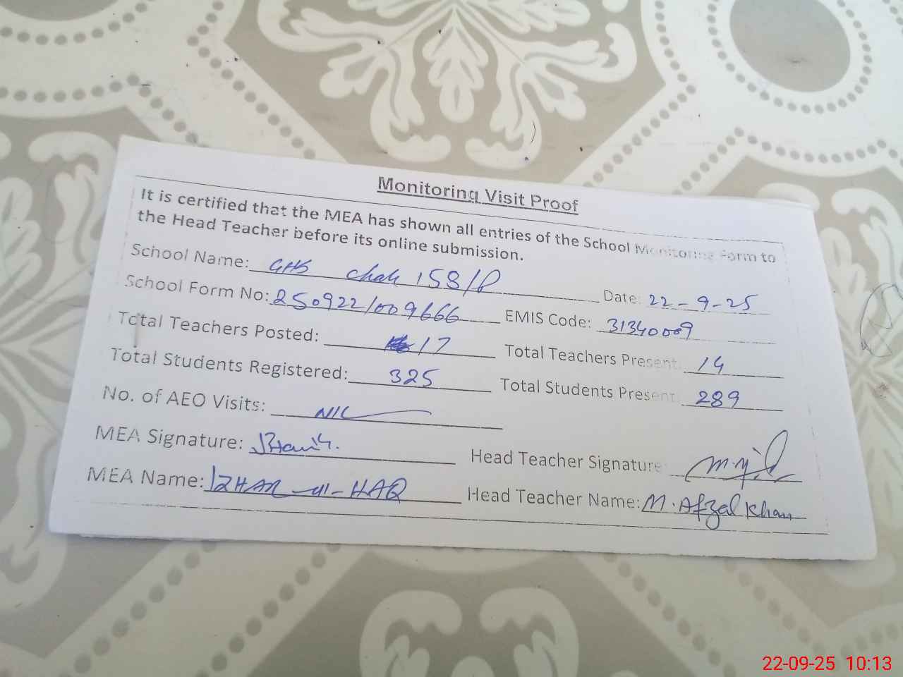 | EMIS Code: 31340009 | Name of School: GHS CHAK NO. 158/P | |||