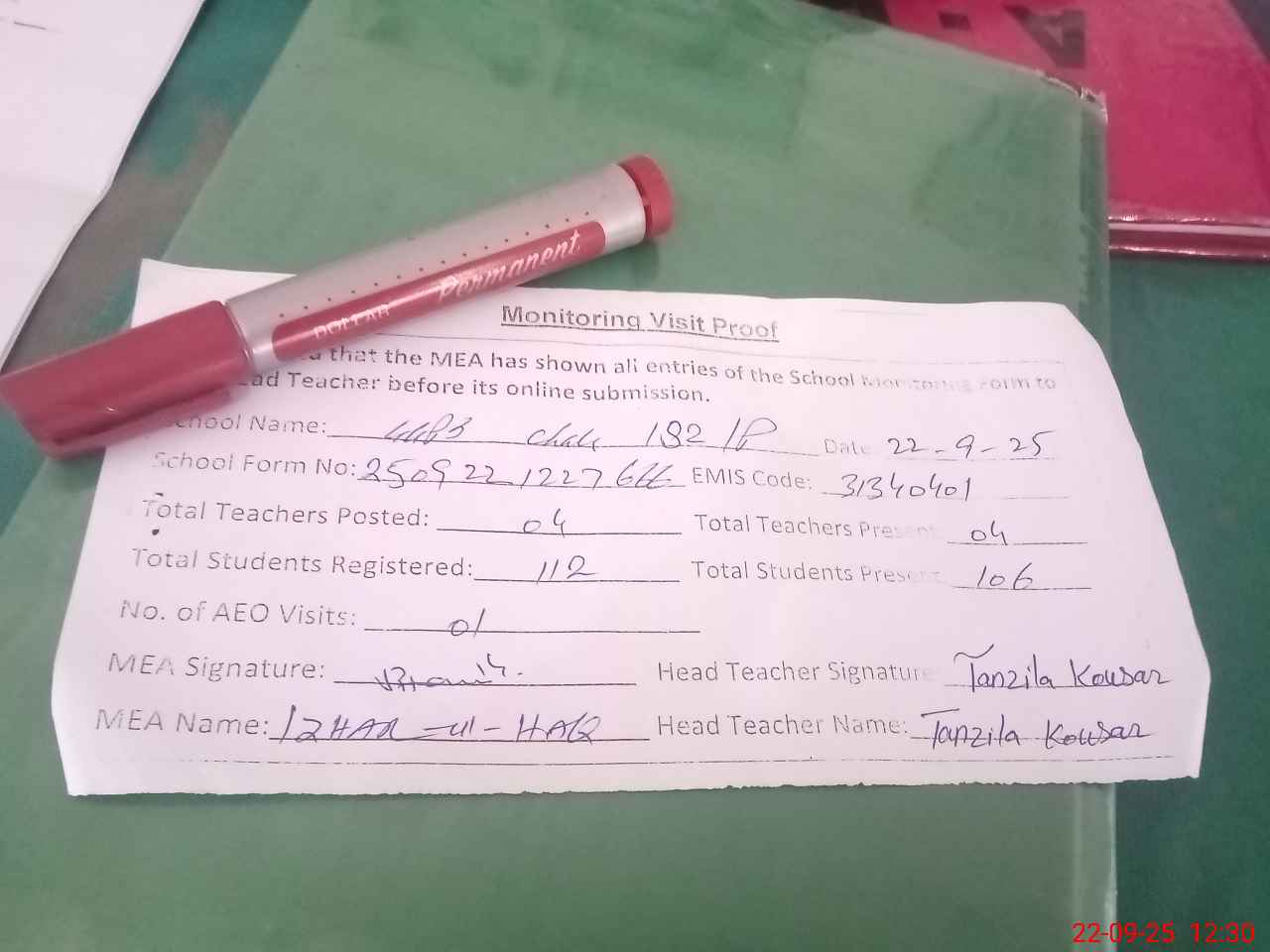 | Attendance Register | Head Teacher | MEA with School | Visit Proof |