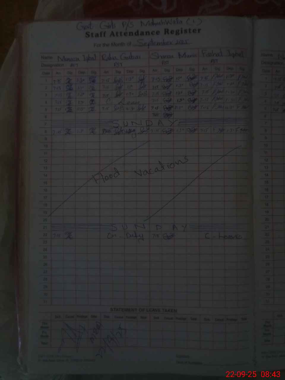| Leave | Duty | Absent | Maternity | Medical | Ex- Pak |