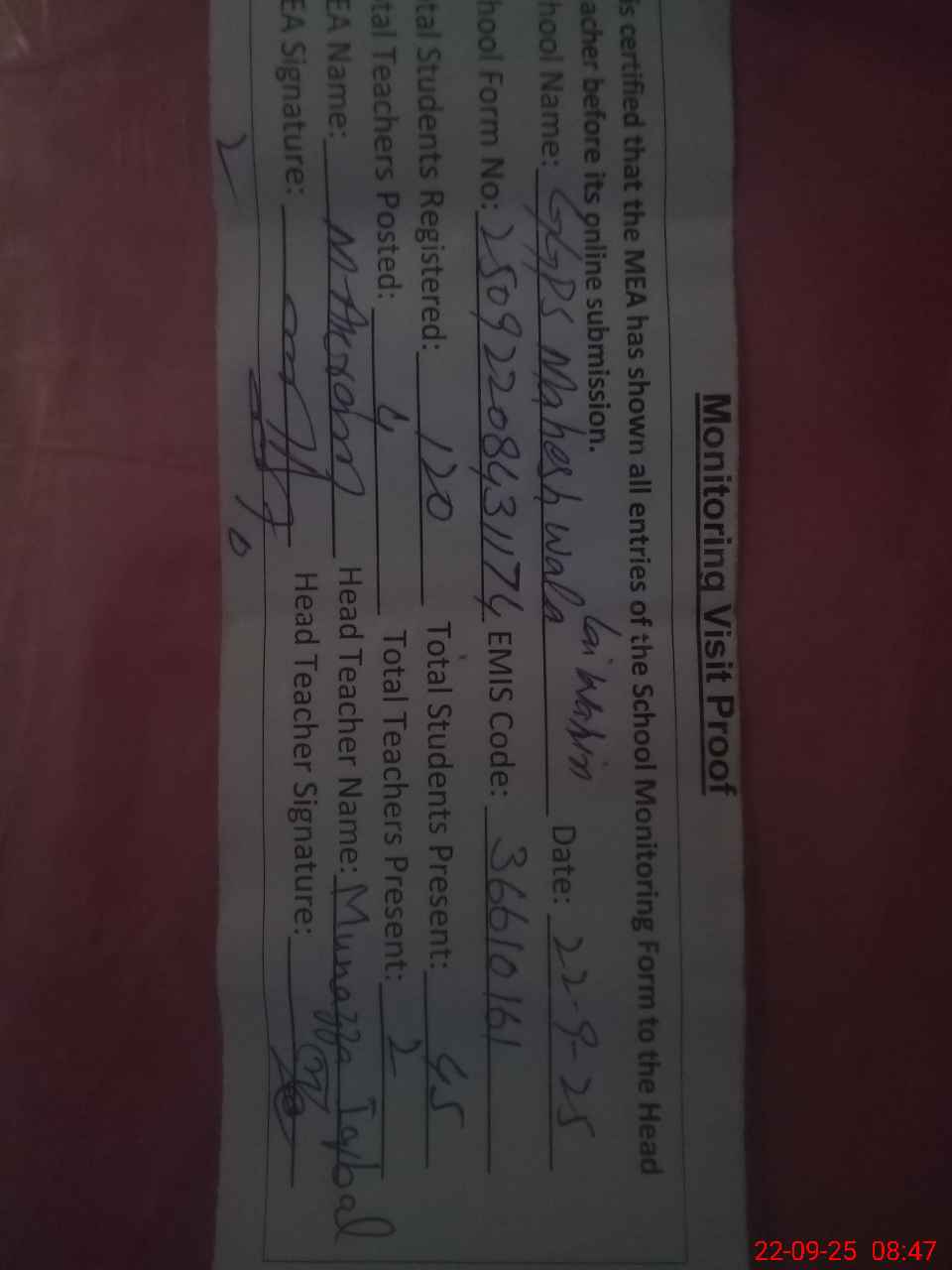 | Attendance Register | Head Teacher | MEA with School | Visit Proof |