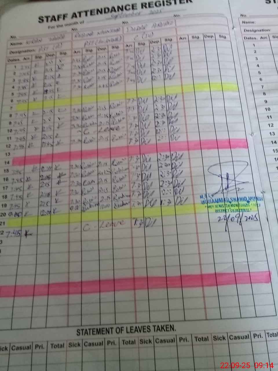 | CNIC | Full Name | Designation | R/C | Absence During Last Calender Month |