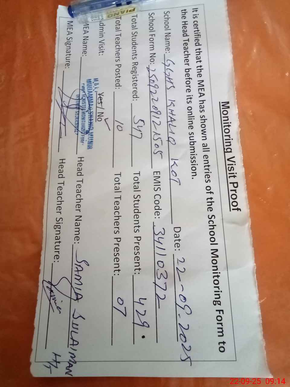 | Attendance Register | Head Teacher | MEA with School | Visit Proof |