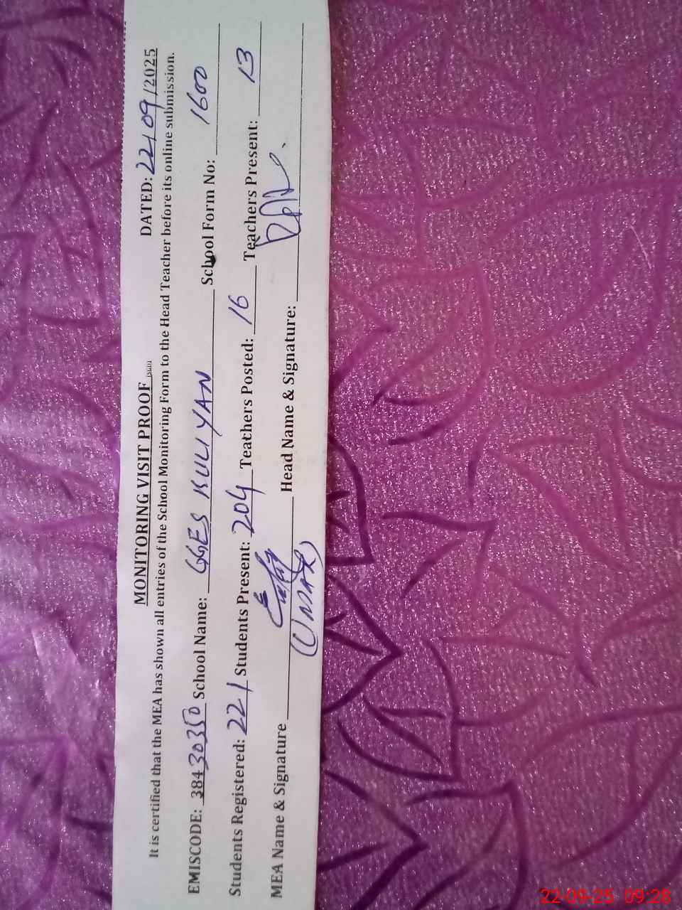| Attendance Register | Head Teacher | MEA with School | Visit Proof |
