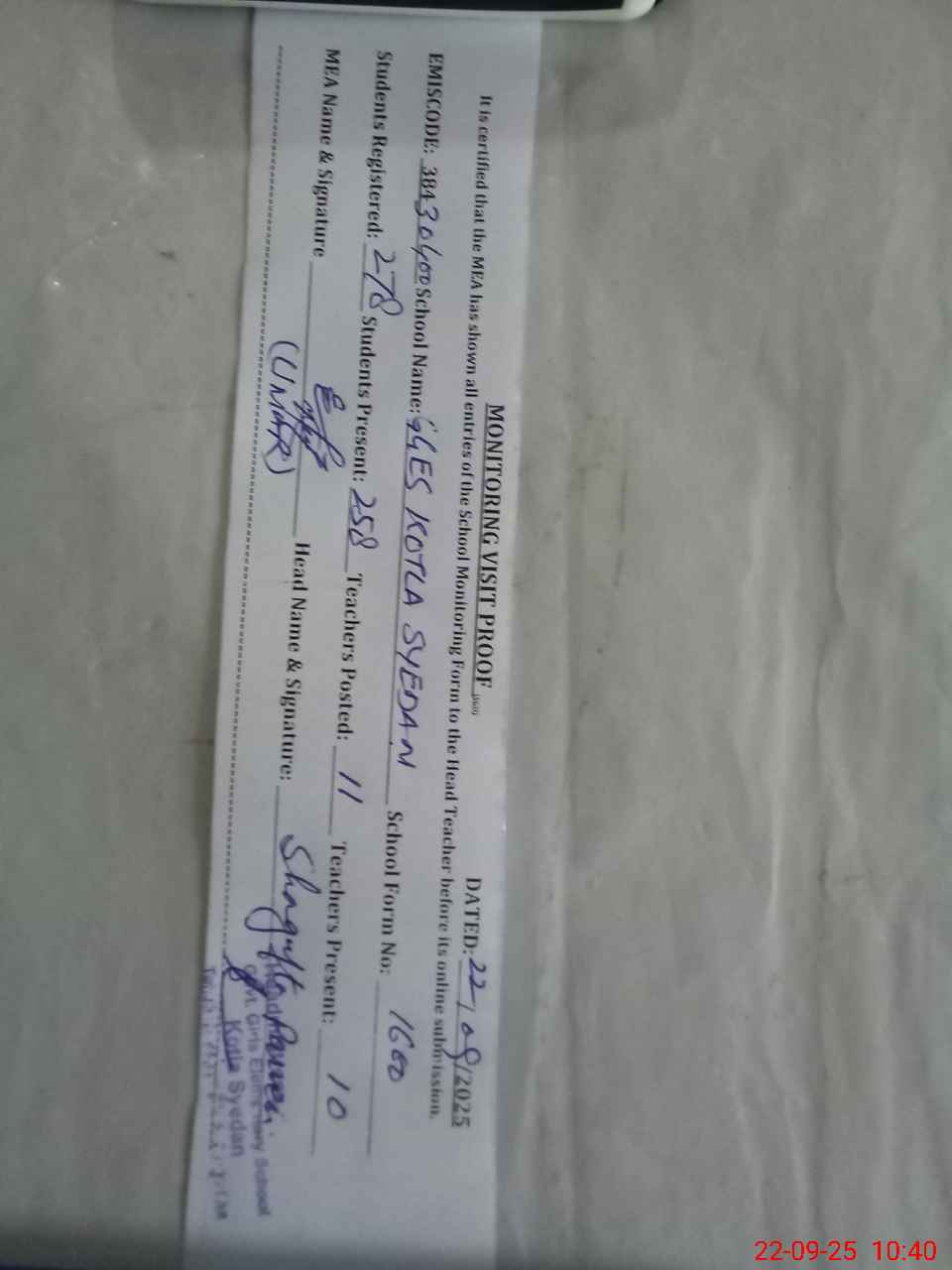 | Certified that this School was Inspected by the Undersigned MEA/DMO Today and the Information Stated Above is as Per Record. | |||||