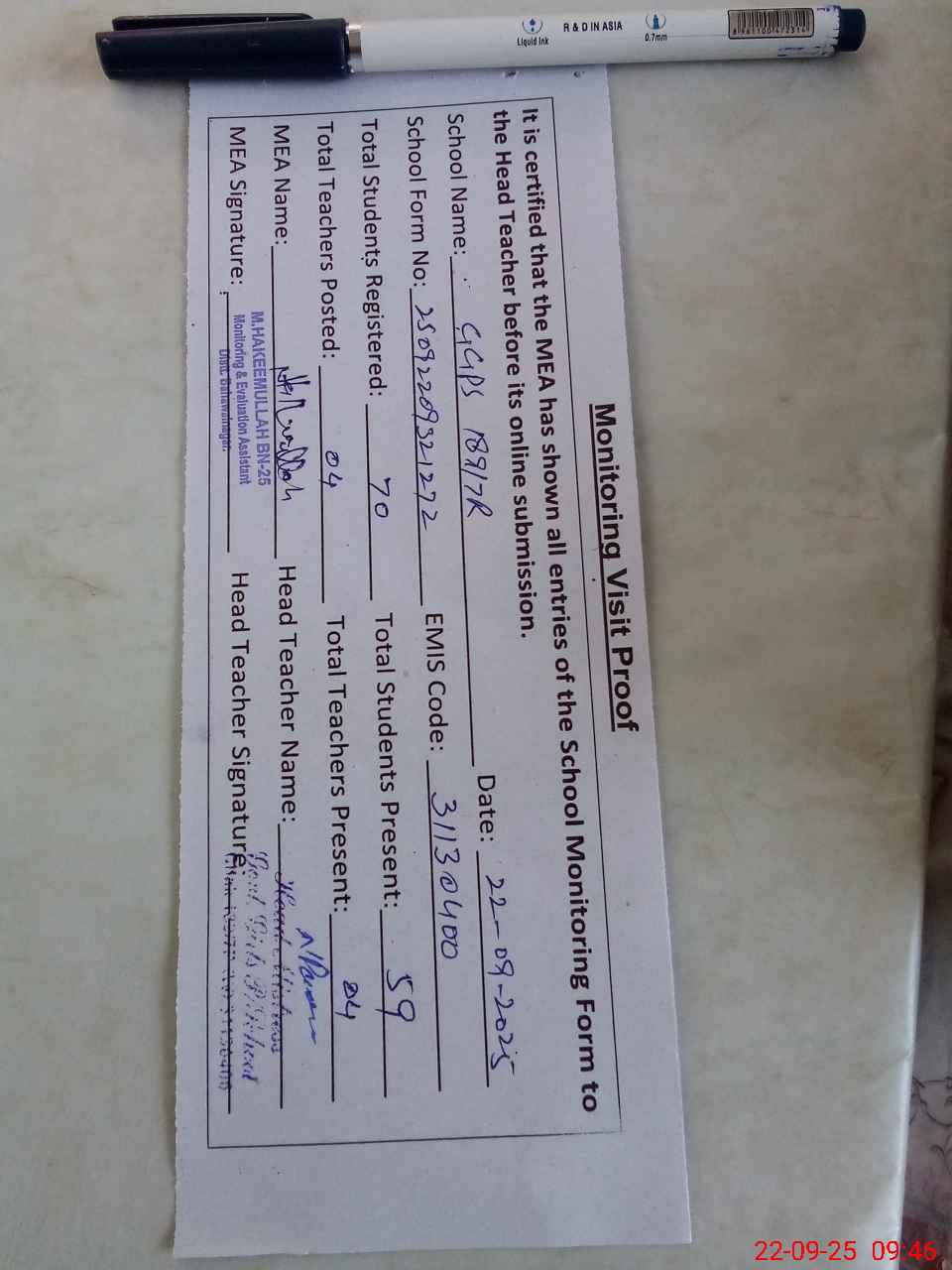 | Attendance Register | Head Teacher | MEA with School | Visit Proof |