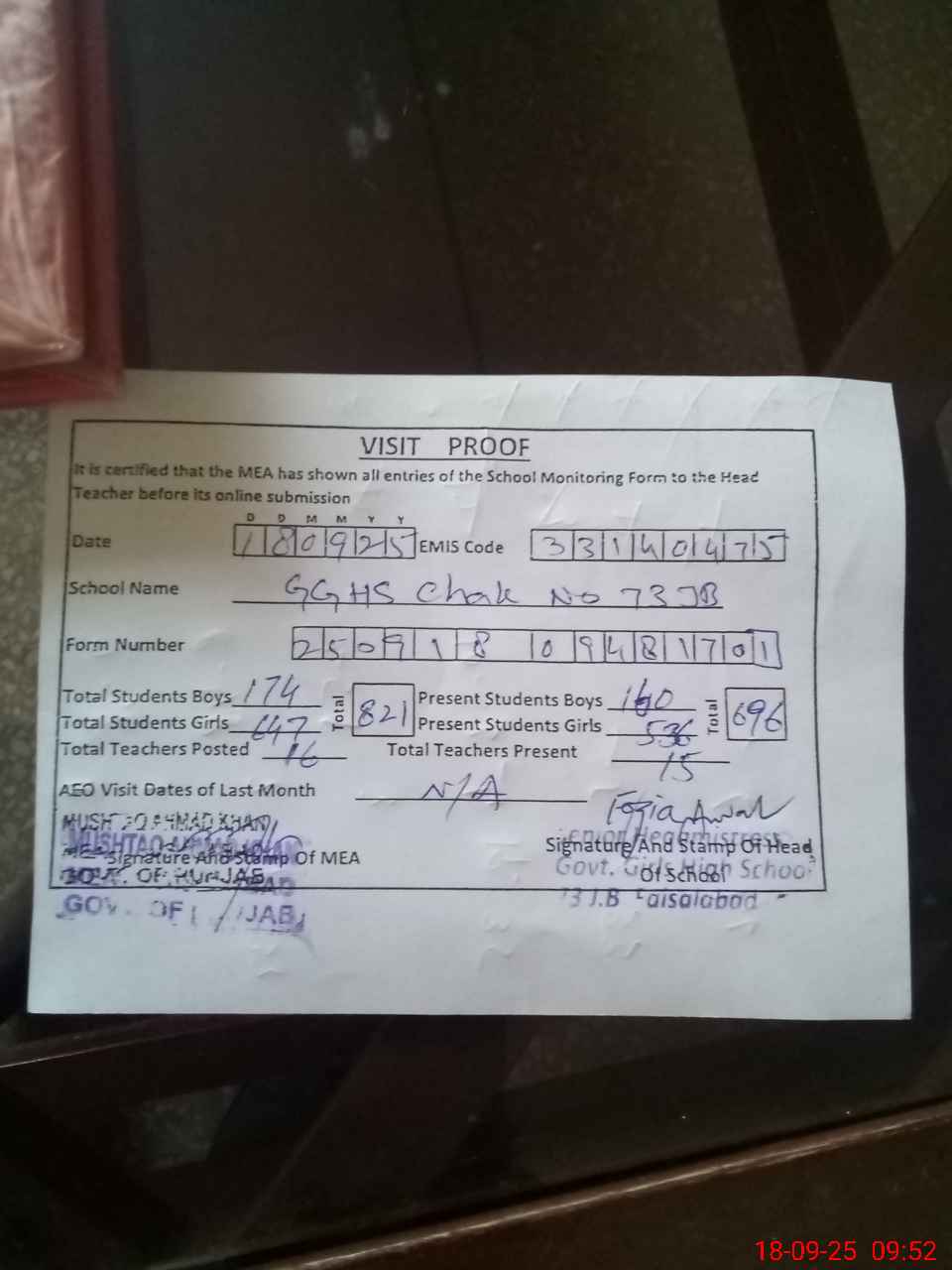 | EMIS Code: 33140475 | Name of School: GGHS CHAK NO 73 JB | |||