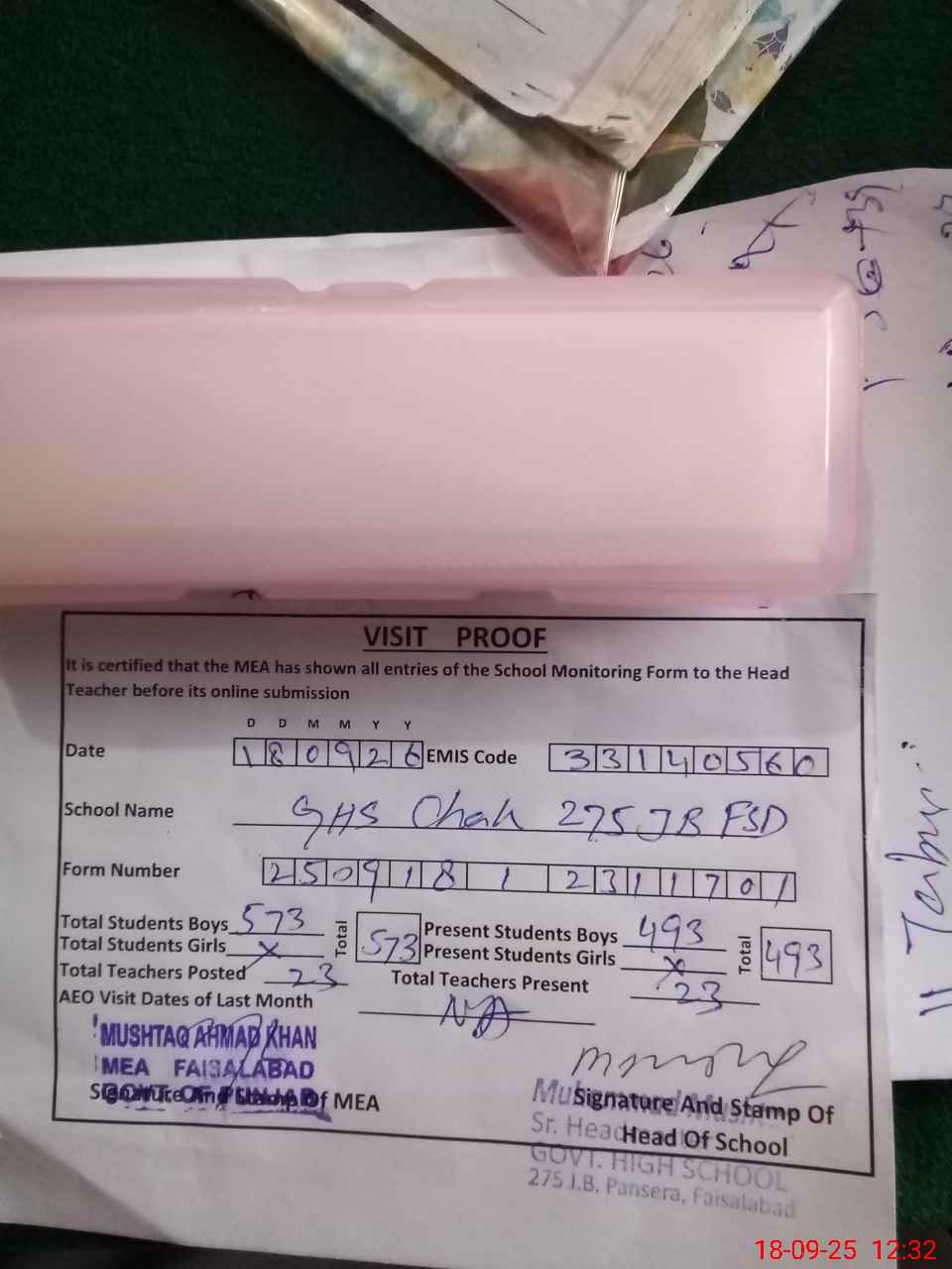 | Attendance Register | Head Teacher | MEA with School | Visit Proof |