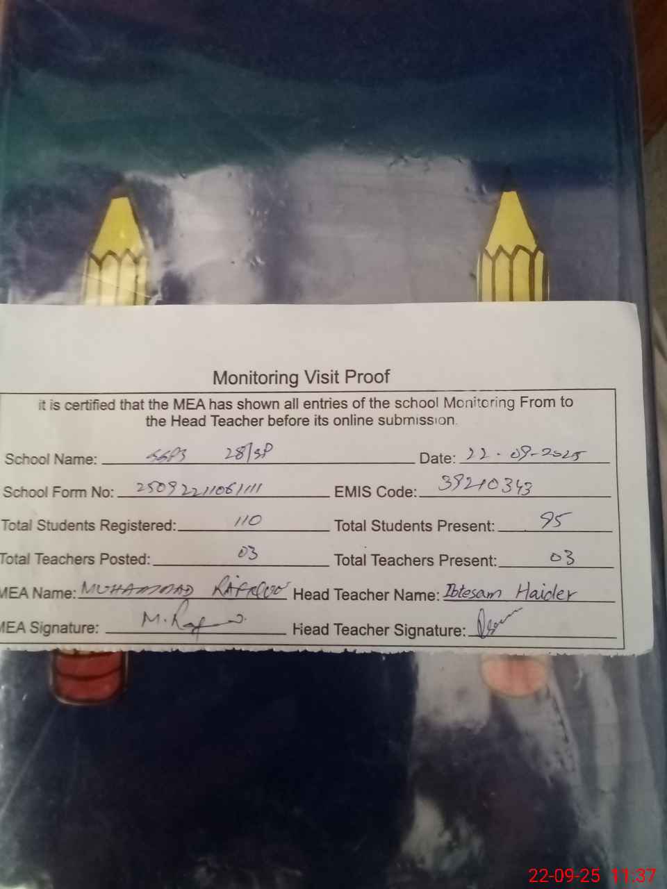 | Attendance Register | Head Teacher | MEA with School | Visit Proof |