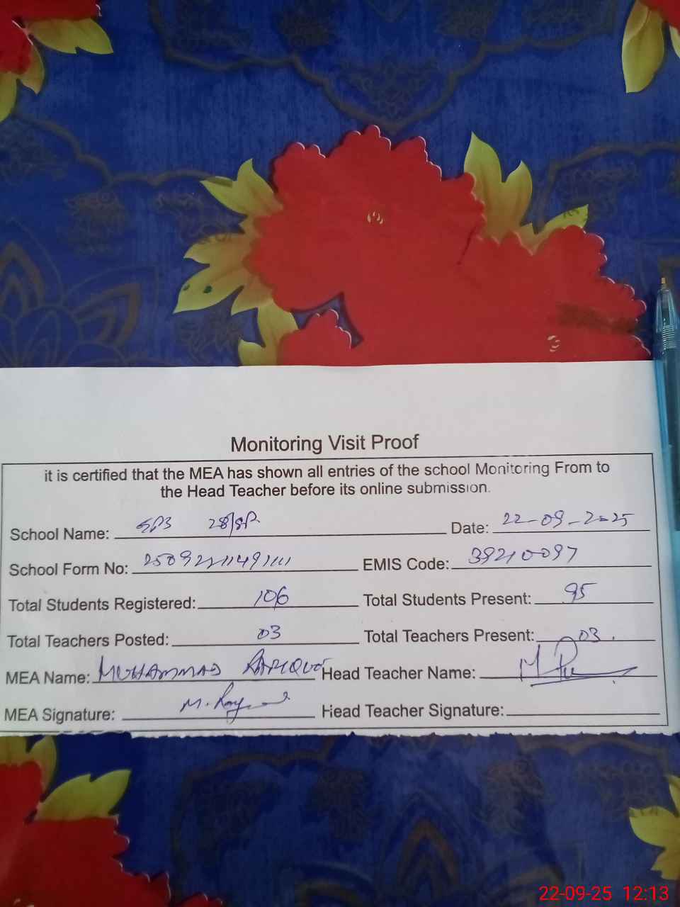 | Attendance Register | Head Teacher | MEA with School | Visit Proof |