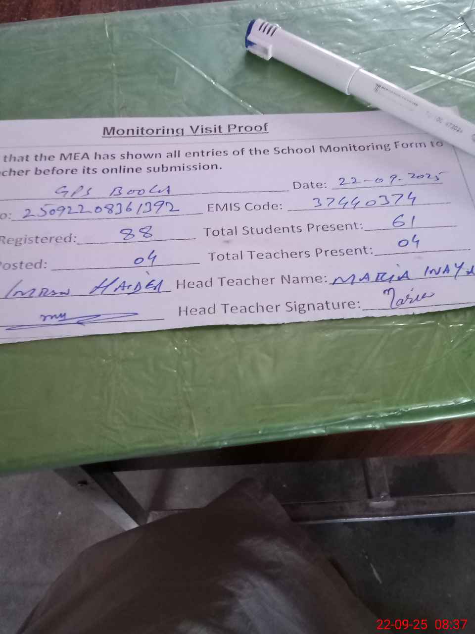 | Attendance Register | Head Teacher | MEA with School | Visit Proof |