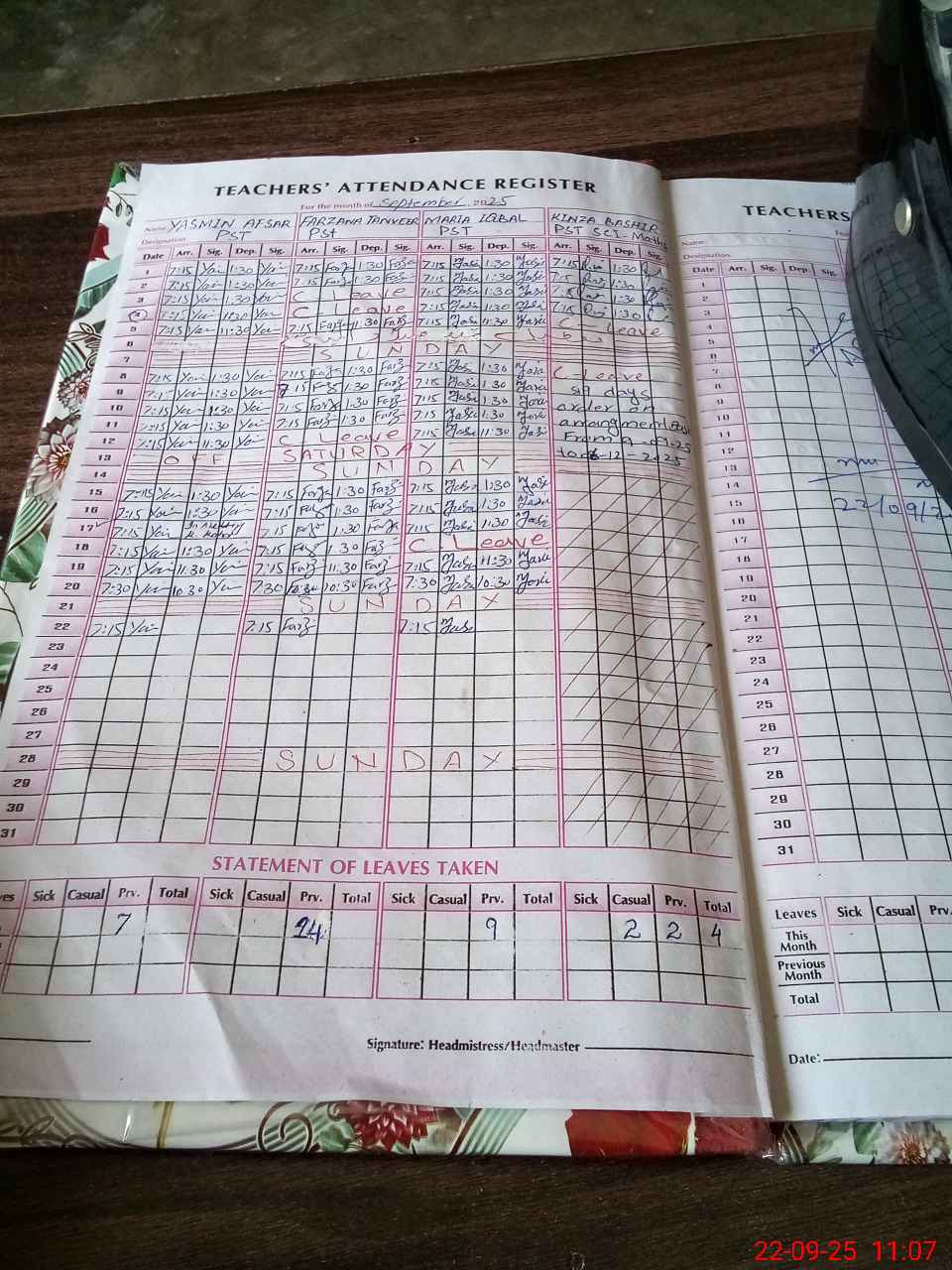 | CNIC | Full Name | Designation | R/C | Absence During Last Calender Month |
