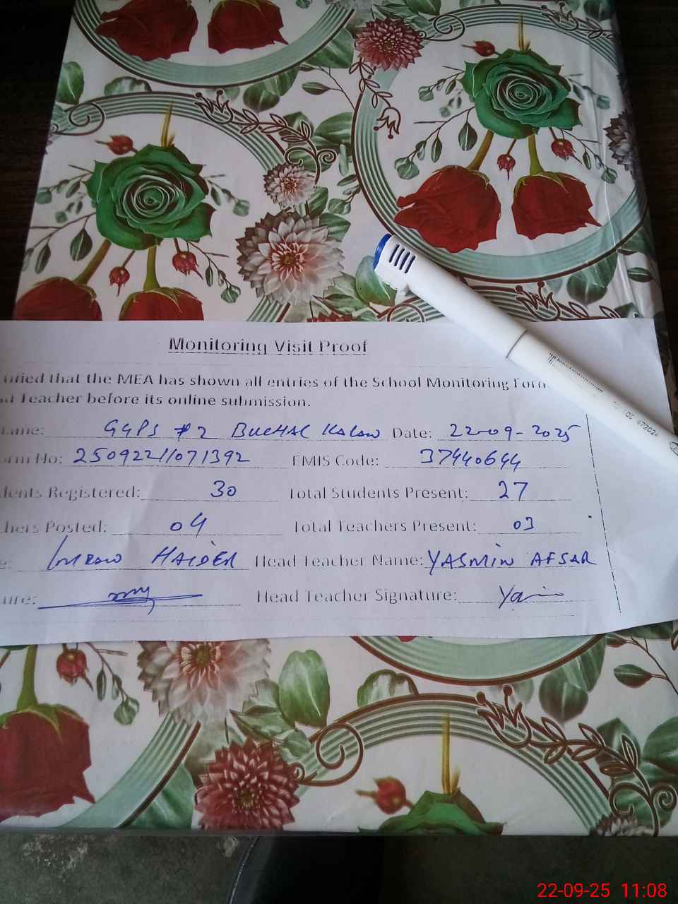 | Attendance Register | Head Teacher | MEA with School | Visit Proof |