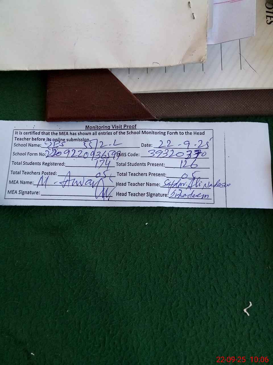 | Attendance Register | Head Teacher | MEA with School | Visit Proof |