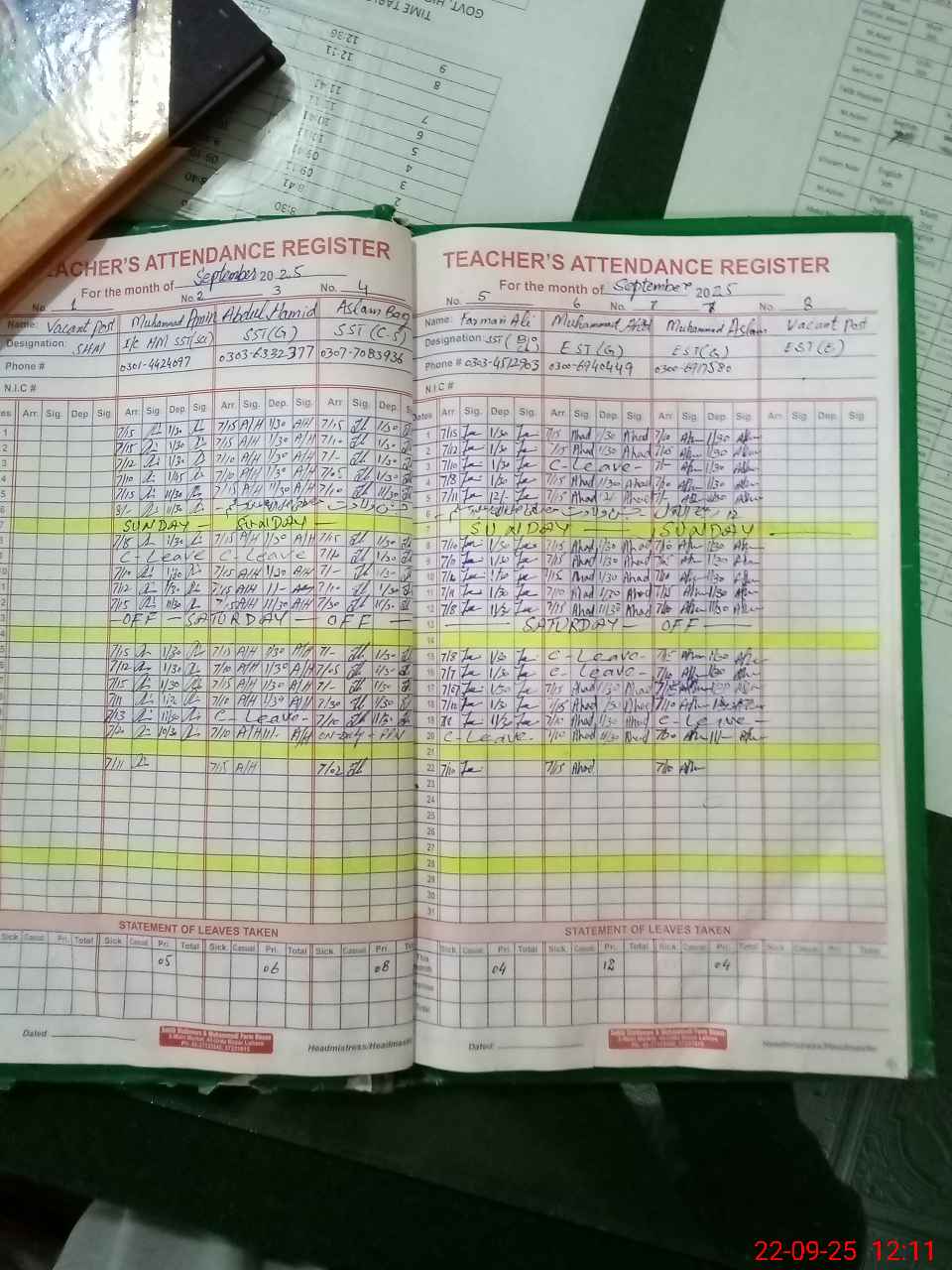 | CNIC | Full Name | Designation | R/C | Absence during last cal. month |