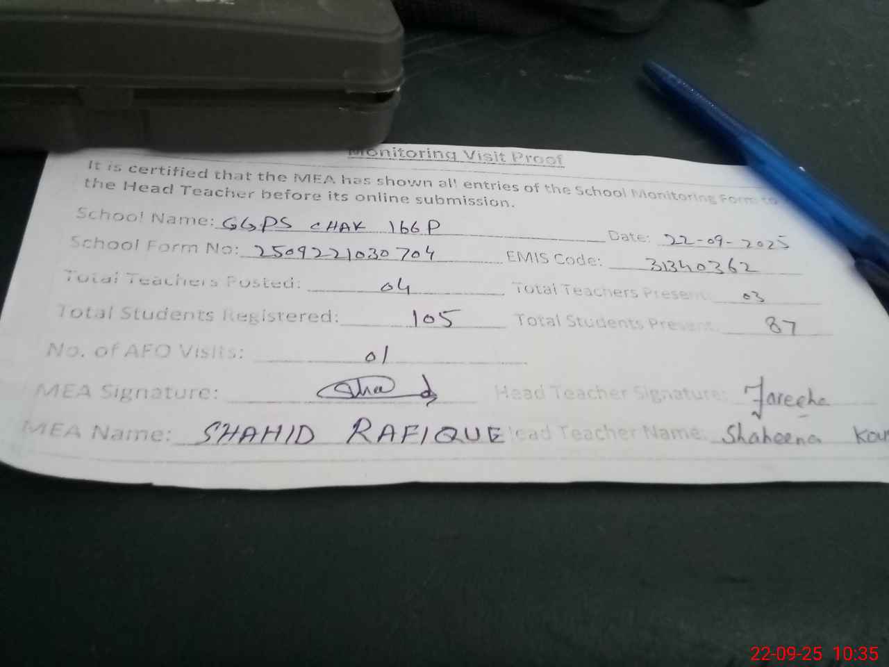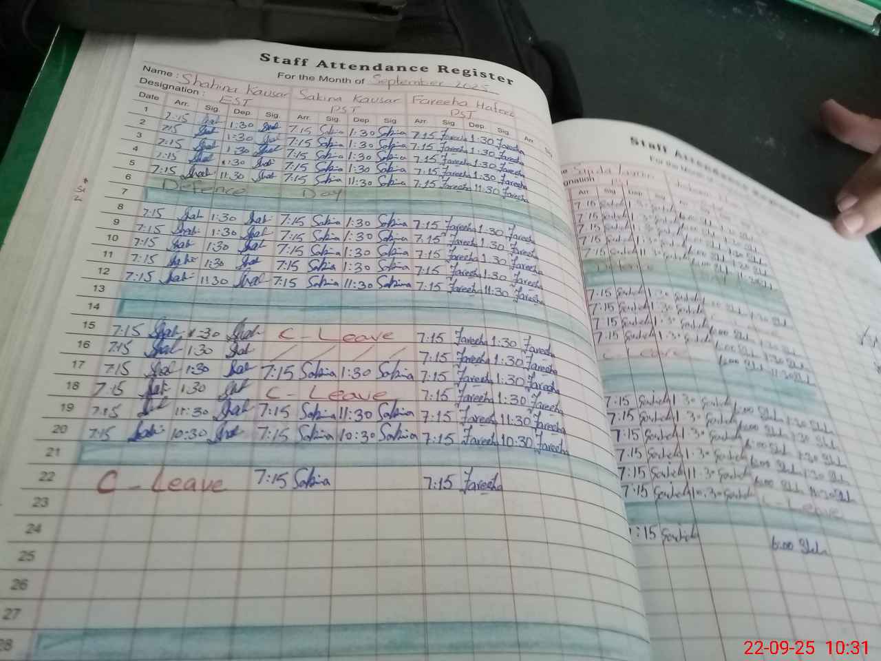 | Attendance Register | Head Teacher | MEA with School | Visit Proof |