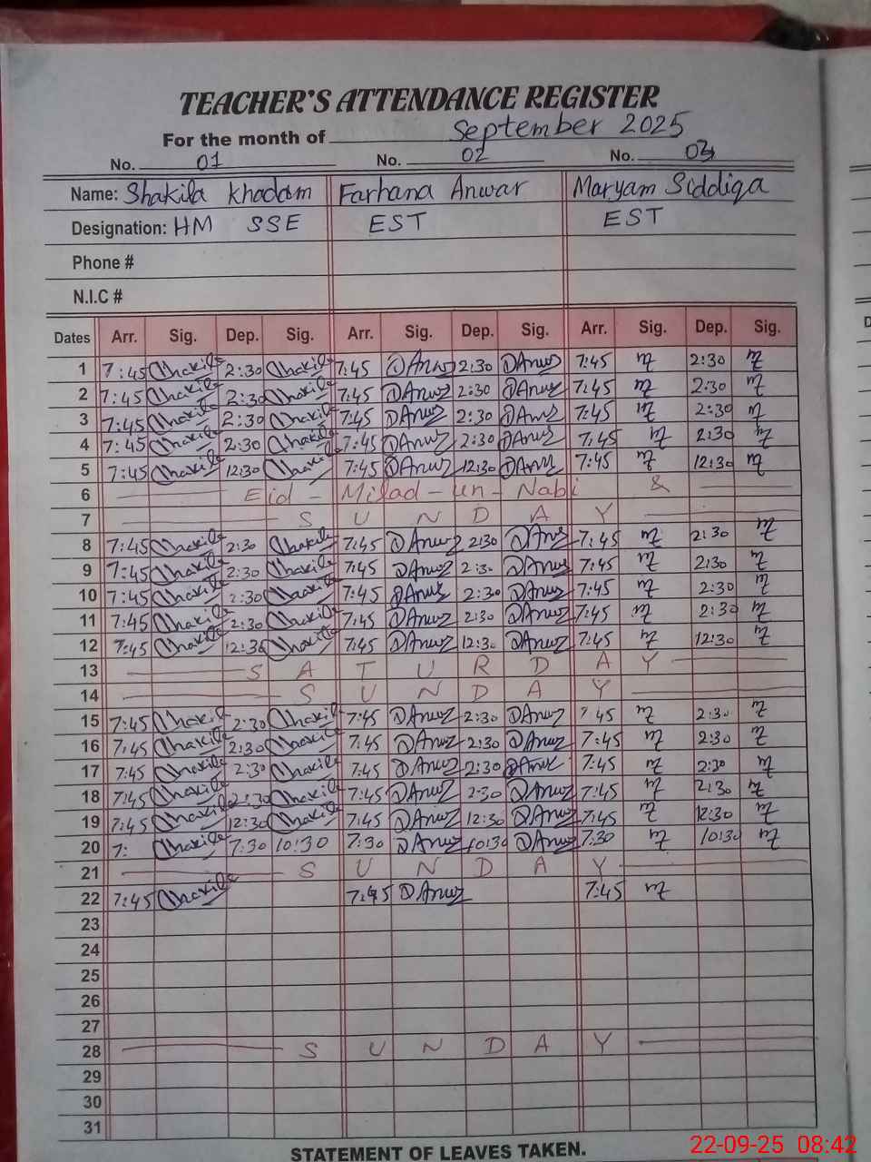 | Remarks (Use Separate Page if Required): Muhammad Amjad CNIC 35202784798683 is marked absent today as physical not available in the School nor latest written Orders of attachment are available Muhammad Abid SG and Nagina Sona Sweepress are attached in said School and both are present today but no written Orders are available of posting or attachment | |||||