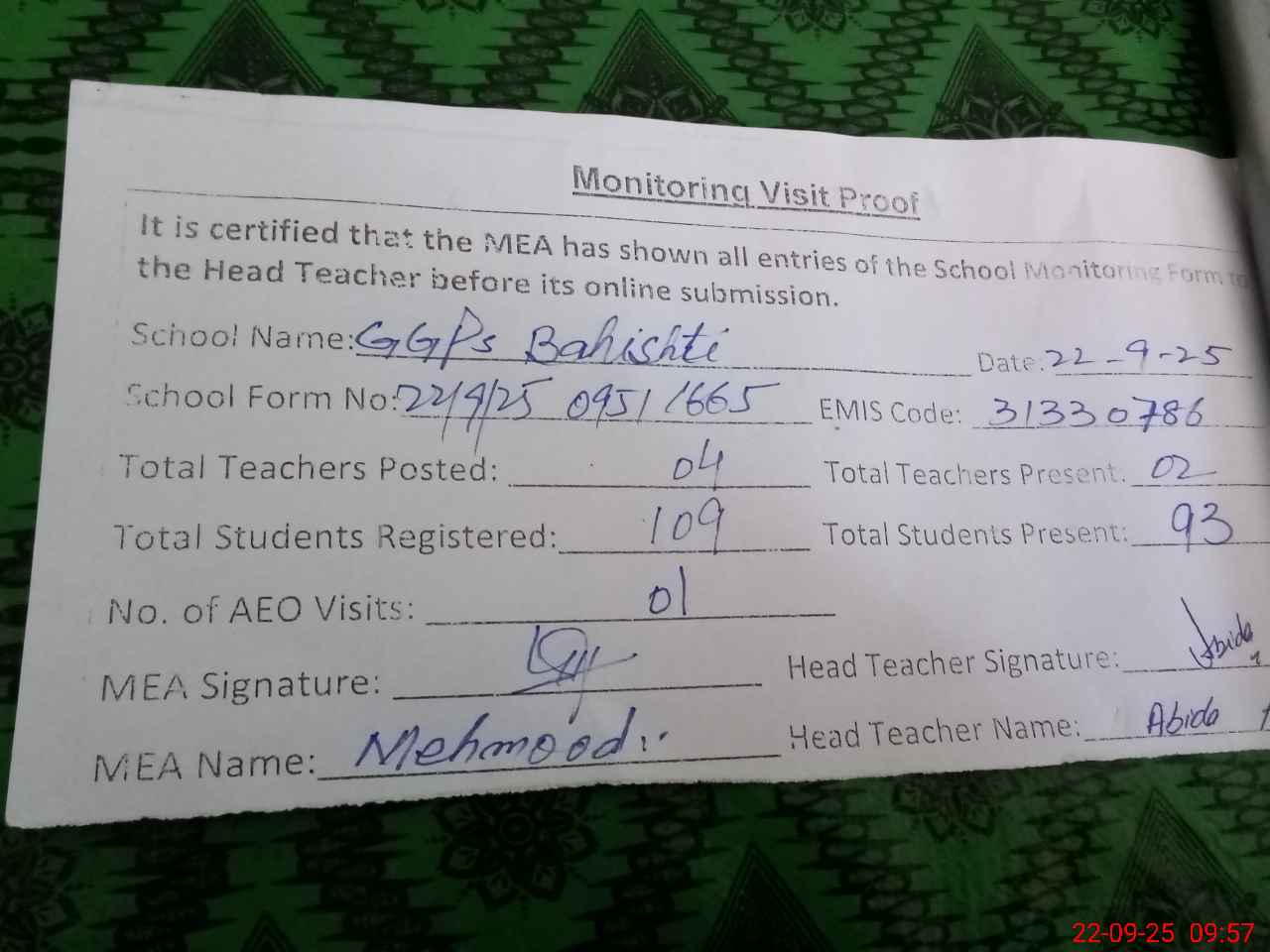 | Attendance Register | Head Teacher | MEA with School | Visit Proof |