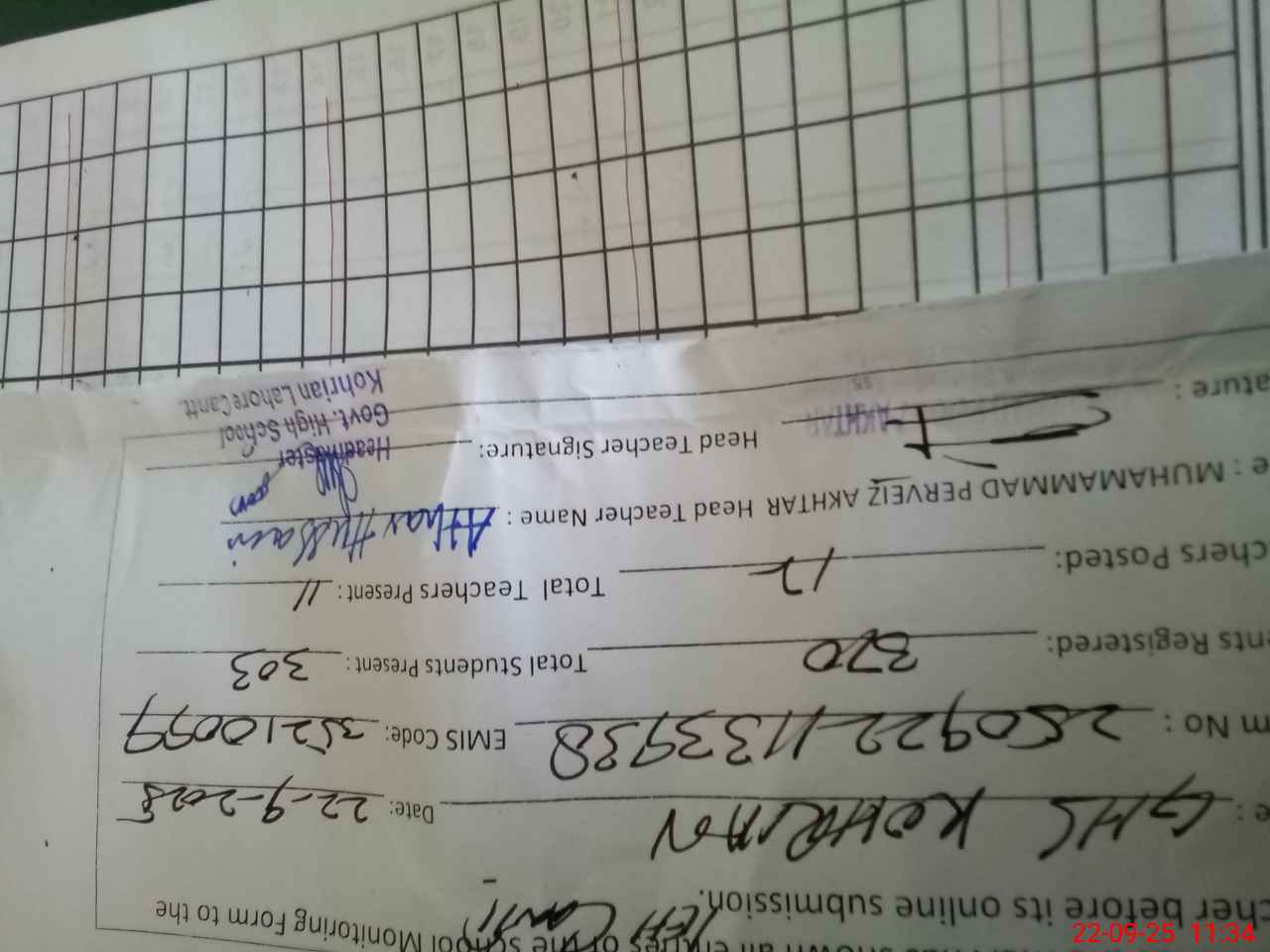 | Total no. of Classrooms: 25 No. of Classrooms Used for Teaching: 11 No. of Classrooms Storing Old Furniture, FTBs, etc: 0Comments if Any: Muhammad Riaz SST absent |