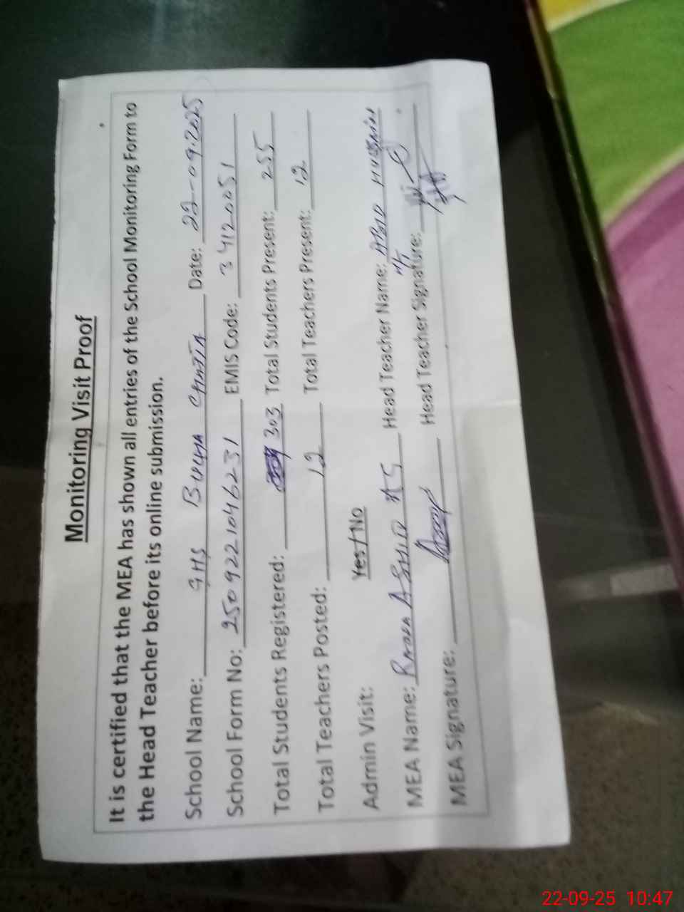 | Attendance Register | Head Teacher | MEA with School | Visit Proof |