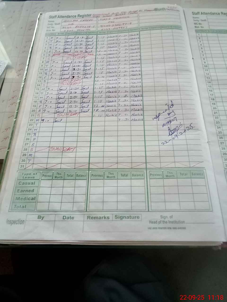 | CNIC | Full Name | Designation | R/C | Absence during last cal. month |