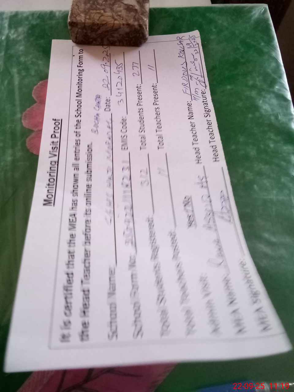 | Attendance Register | Head Teacher | MEA with School | Visit Proof |
