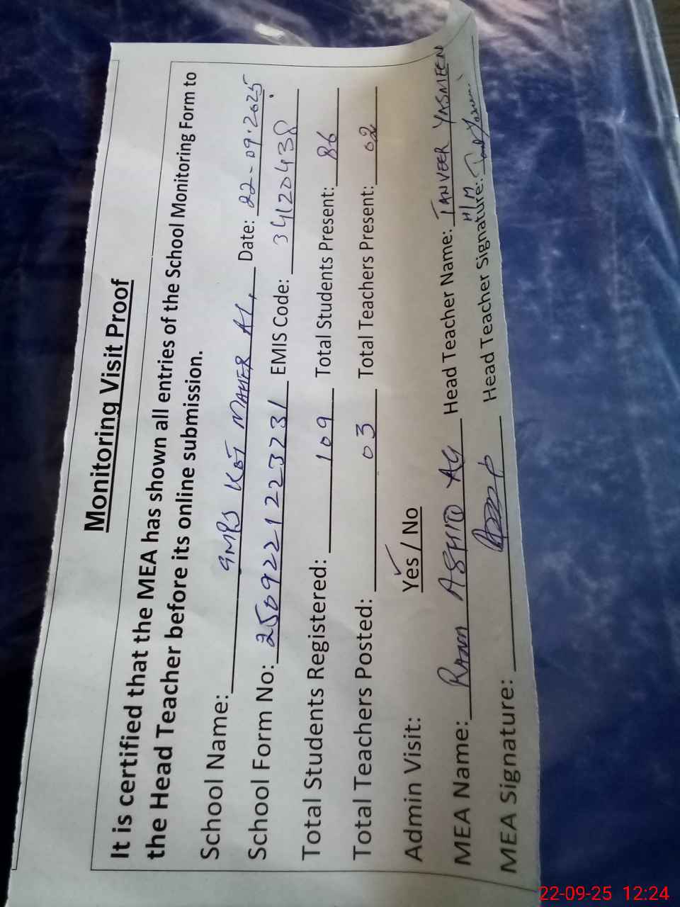 | Attendance Register | Head Teacher | MEA with School | Visit Proof |