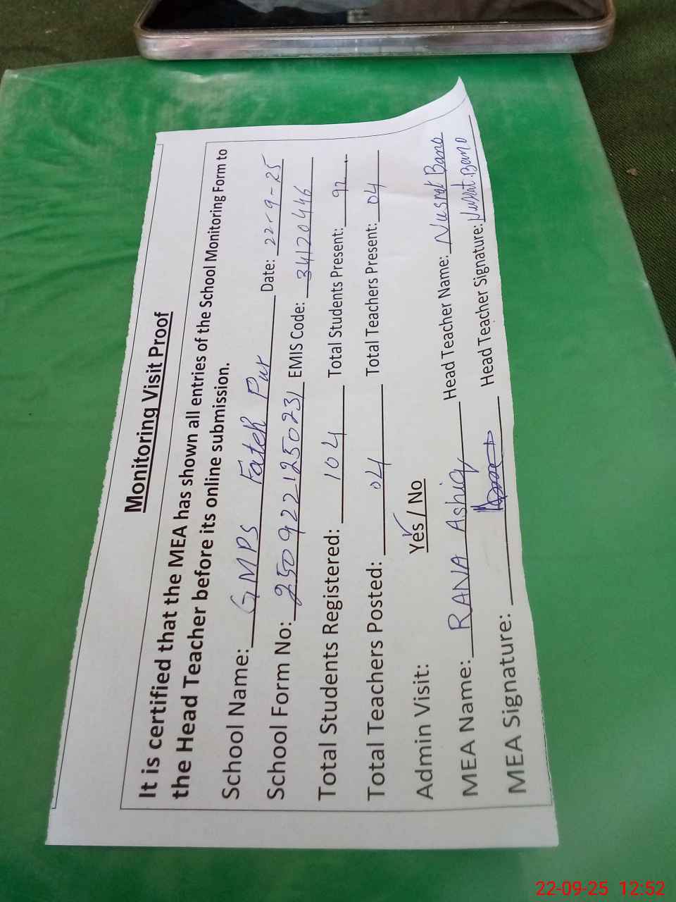 | EMIS Code: 34120446 | Name of School: GMPS FATEH PUR | |||