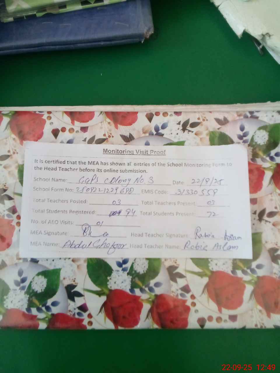 | Attendance Register | Head Teacher | MEA with School | Visit Proof |