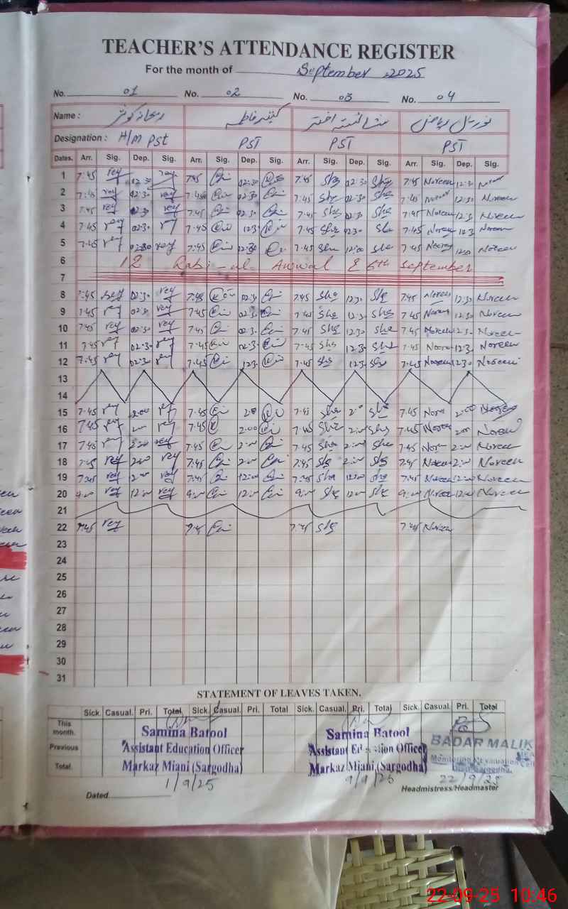 | District: SARGODHA | Tehsil: BHERA | Markaz: MIANI - FEMALE | Level: Primary | |