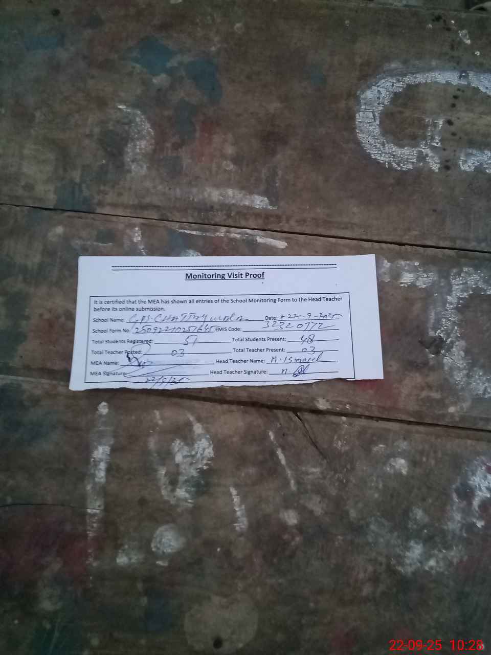 | Attendance Register | Head Teacher | MEA with School | Visit Proof |