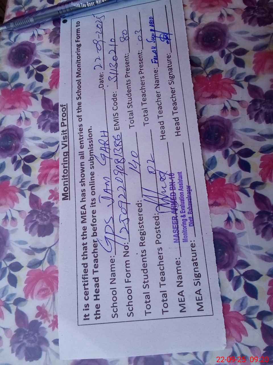 | EMIS Code: 31130210 | Name of School: GPS JAM GARH | |||