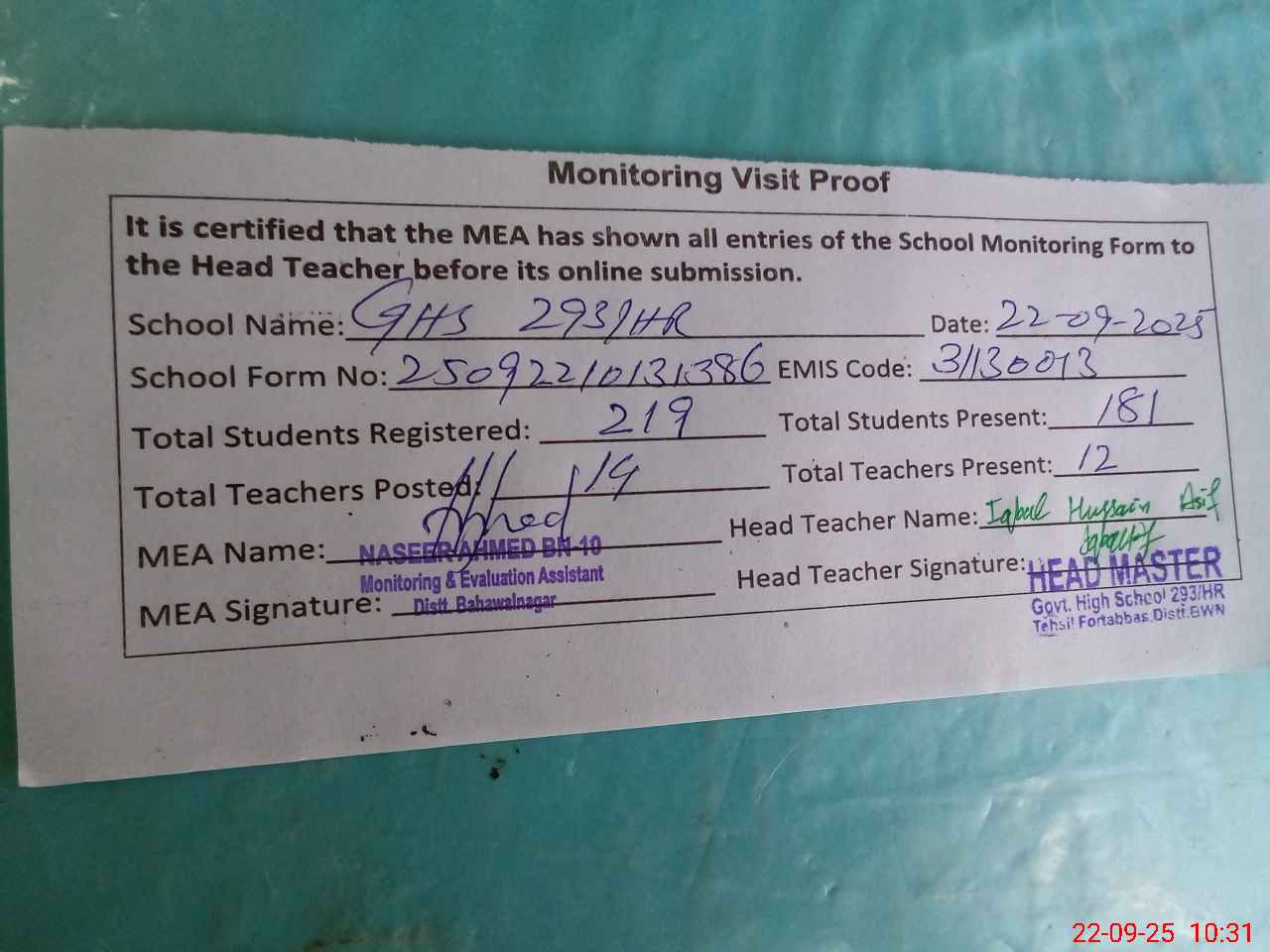 | EMIS Code: 31130013 | Name of School: GHS CHAK 293/HR | |||
