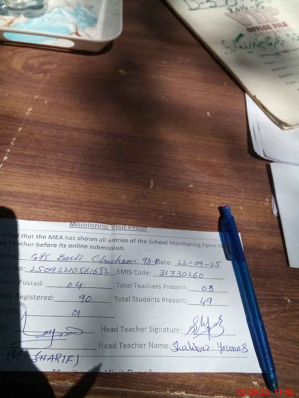 | Attendance Register | Head Teacher | MEA with School | Visit Proof |