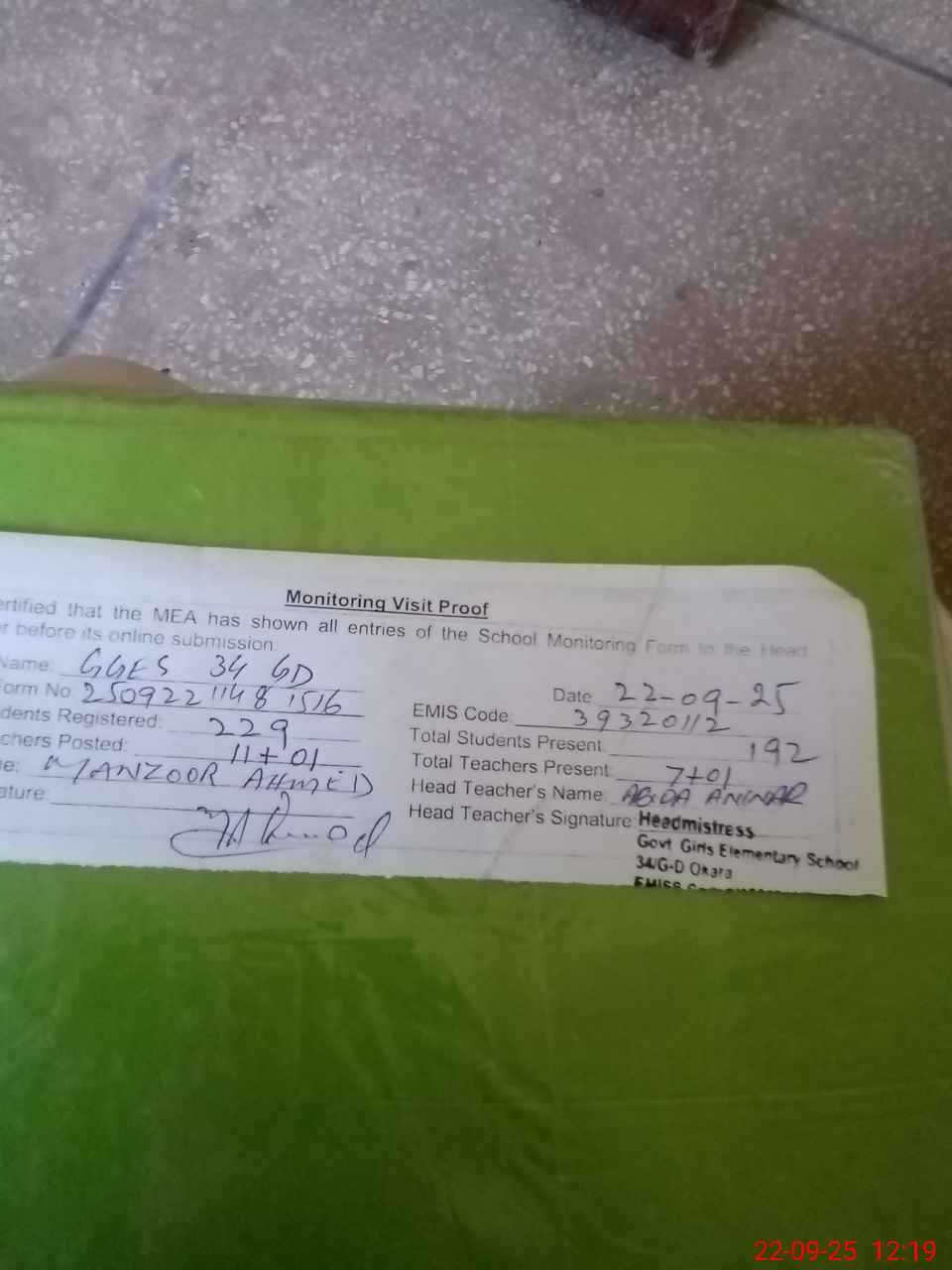 | Attendance Register | Head Teacher | MEA with School | Visit Proof |