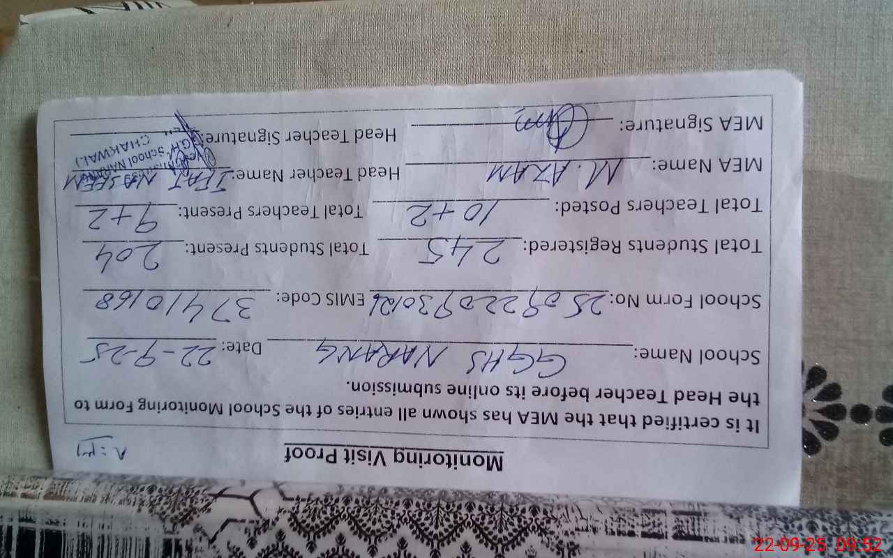 | Certified that this School was Inspected by the Undersigned MEA/DMO Today and the Information Stated Above is as Per Record. | |||||