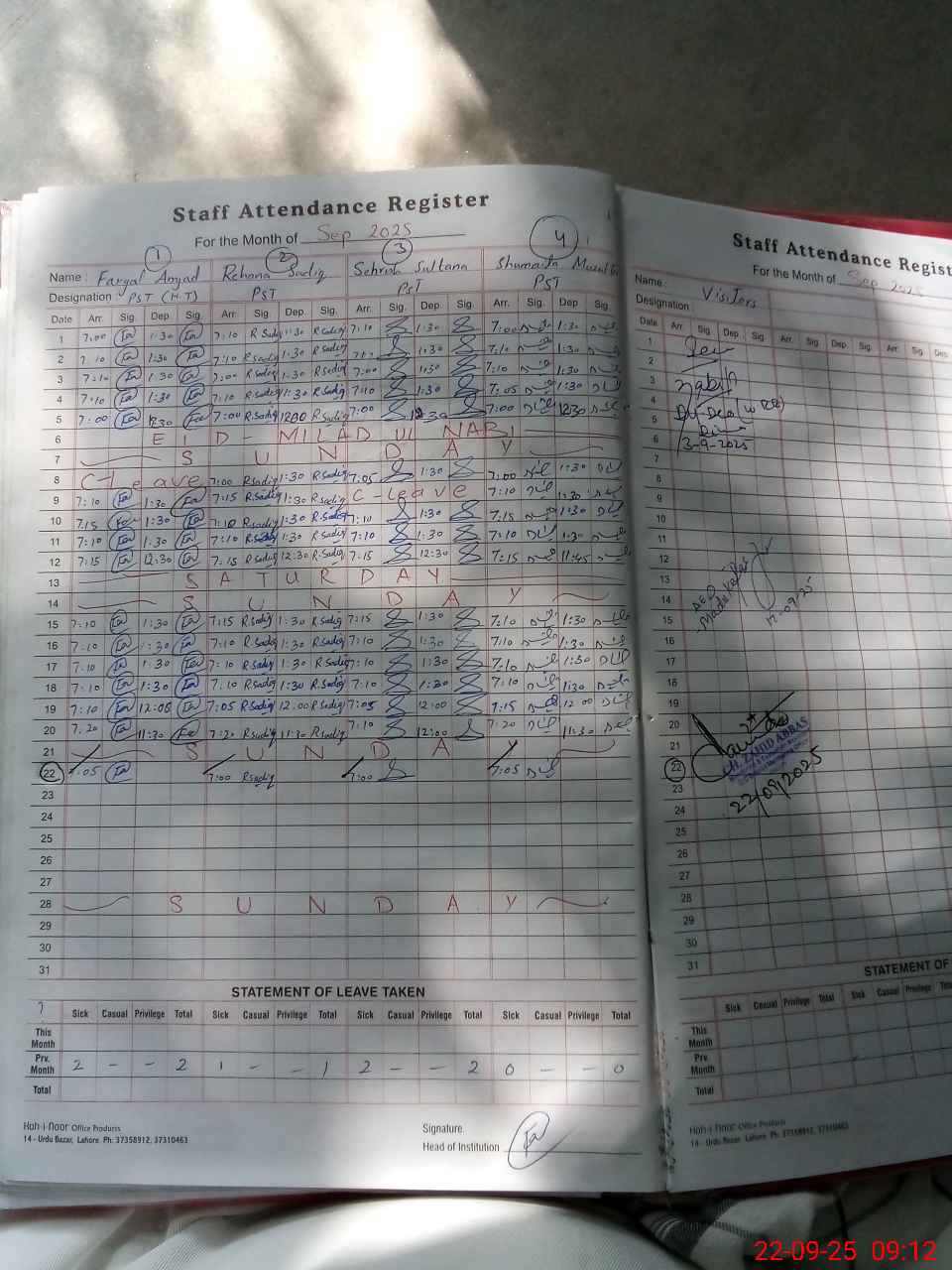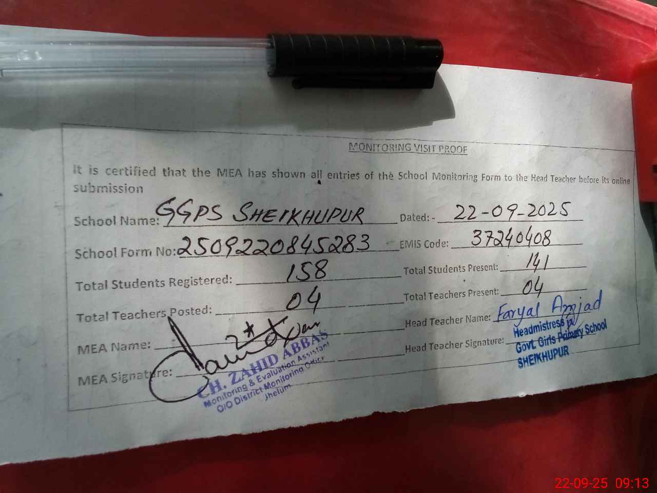 | Attendance Register | Head Teacher | MEA with School | Visit Proof |