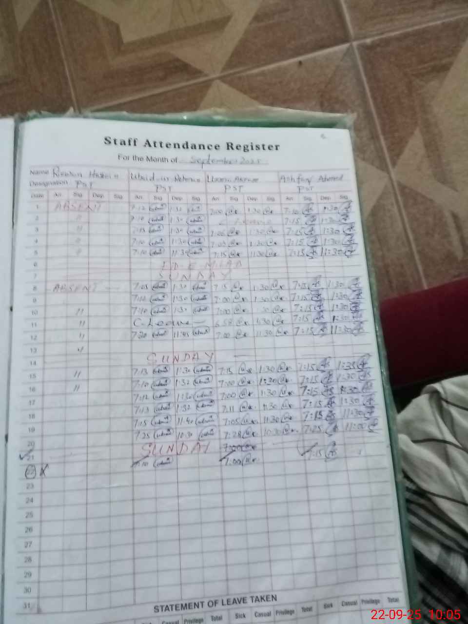 | 37**** | Ri**** Hu**** | 1 | 0 | 0 | 0 | 0 | 0 | 0 | 0 | 0 | 0 | Absent (Un-Authorized) | |