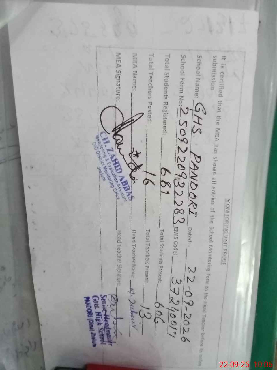 | Monitoring Date: 22-09-2025 | Start Time: 22-09-2025 09:23 AM | End Time: 22-09-2025 10:10 AM | Name of MEA: Za**** Ab**** | |