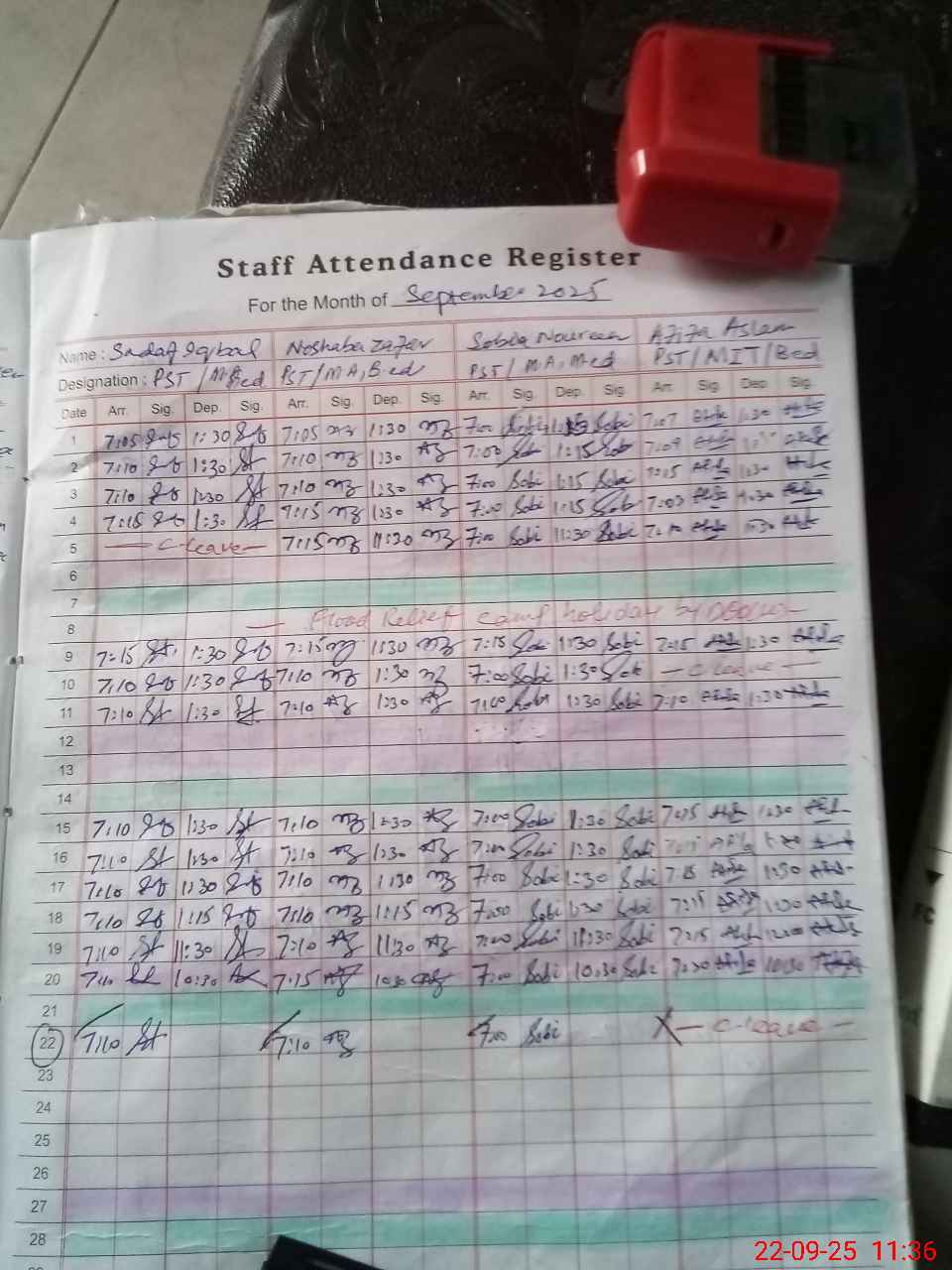 | Total no. of Classrooms: 16 No. of Classrooms Used for Teaching: 11 No. of Classrooms Storing Old Furniture, FTBs, etc: 0Comments if Any: Afifa Aslam pst teacher marked leave in attendance register but no online leave available when asked to head teacher so teacher Afifa Aslam is un authorized absent from school during my visit |