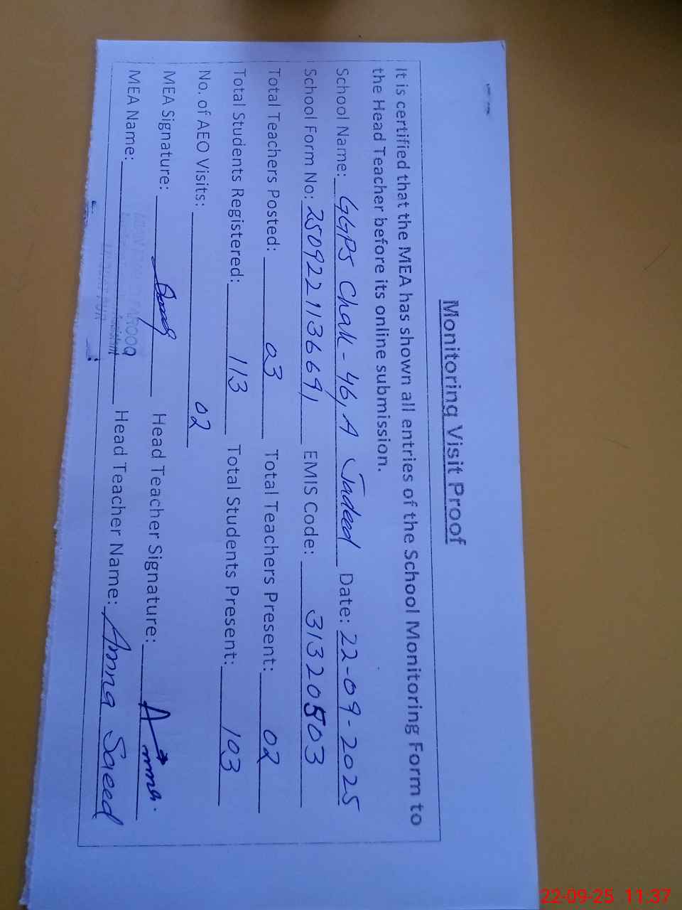 | Attendance Register | Head Teacher | MEA with School | Visit Proof |