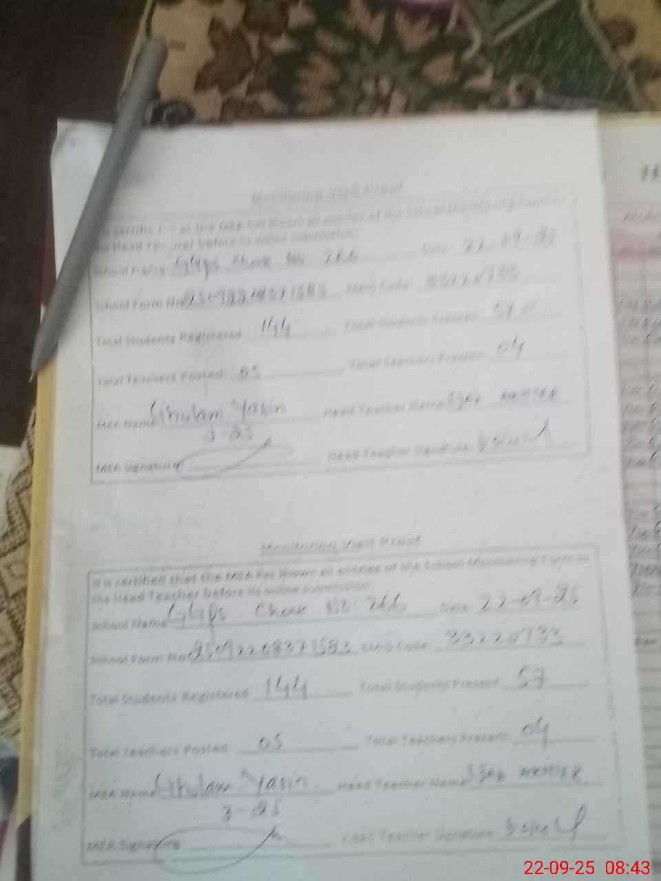 | Attendance Register | Head Teacher | MEA with School | Visit Proof |