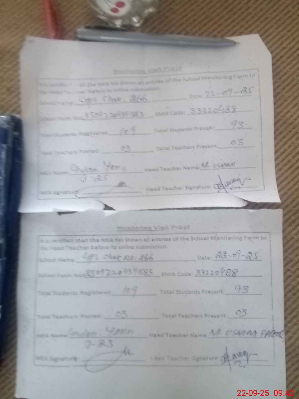 | Attendance Register | Head Teacher | MEA with School | Visit Proof |