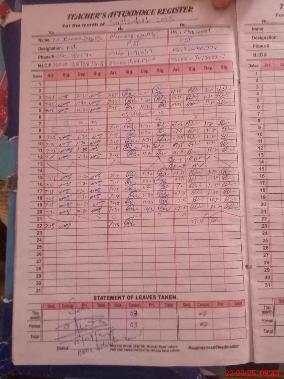 | CNIC | Full Name | Designation | R/C | Absence During Last Calender Month |
