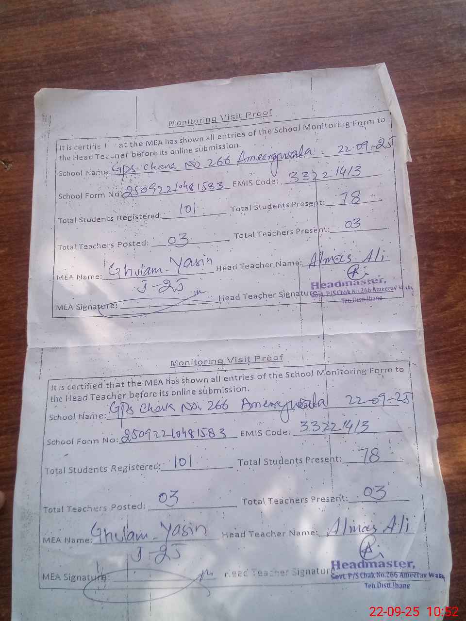 | Attendance Register | Head Teacher | MEA with School | Visit Proof |