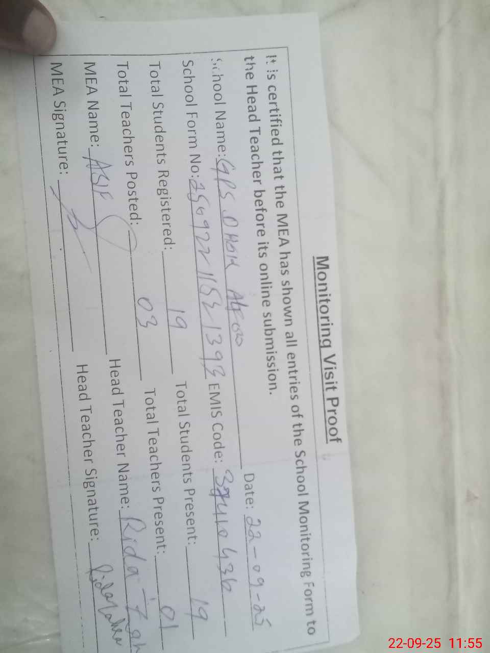 | Certified that this School was Inspected by the Undersigned MEA/DMO Today and the Information Stated Above is as Per Record. | |||||