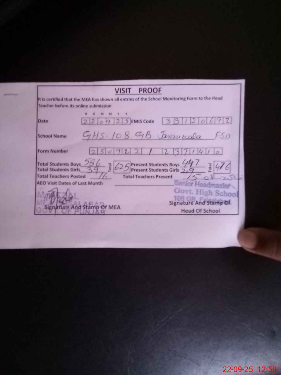 | Attendance Register | Head Teacher | MEA with School | Visit Proof |