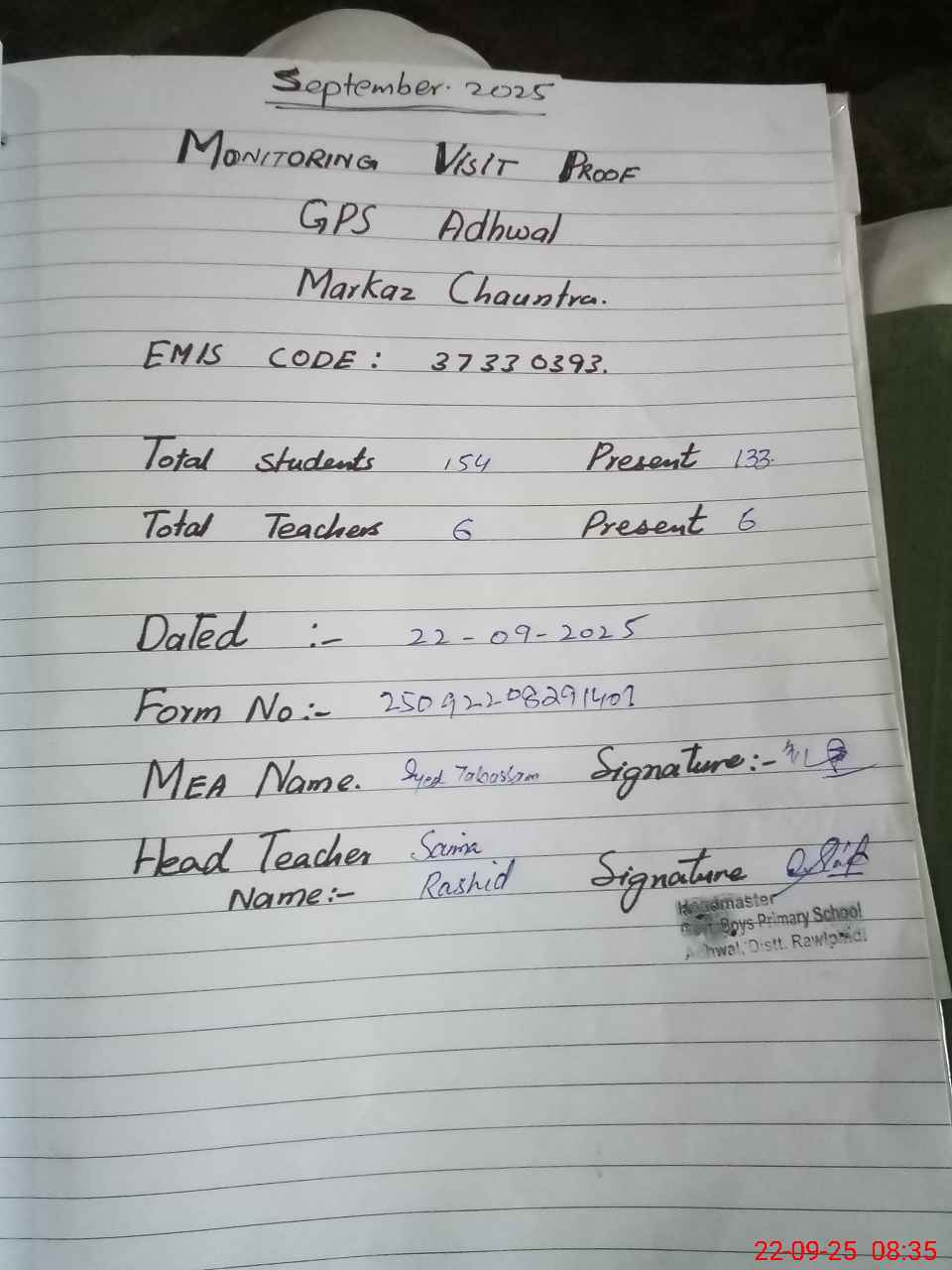 | EMIS Code: 37330393 | Name of School: GPS ADHAWAL | |||